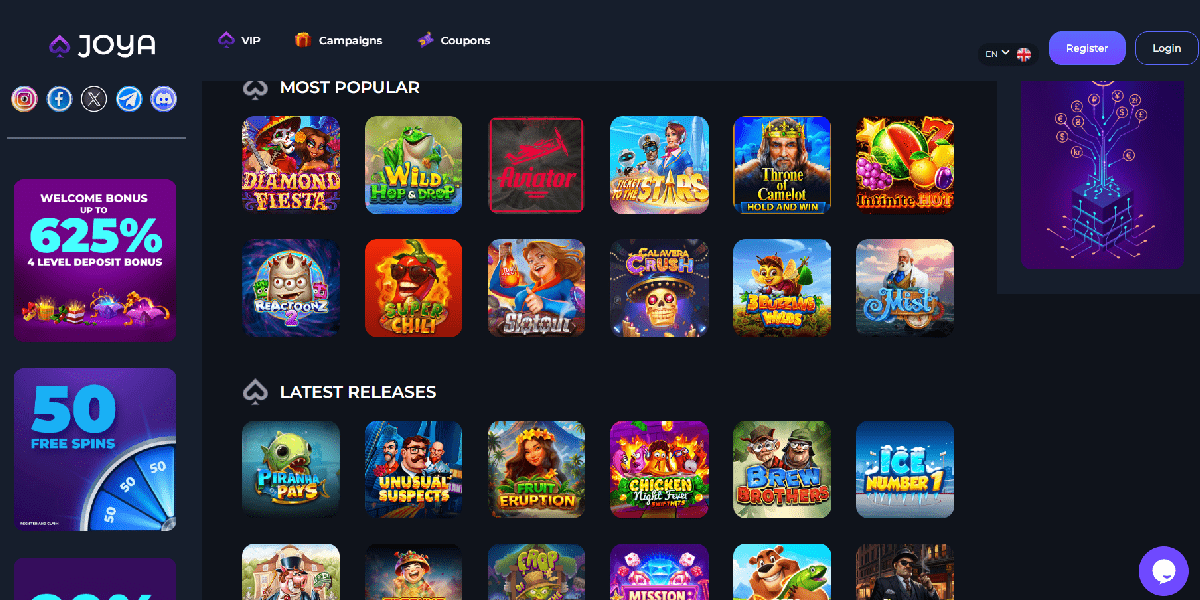 Um den Spielern das bestmögliche iGaming-Erlebnis zu bieten, hat sich Joya Casino mit mehr als 70 dieser Softwareentwickler zusammengetan, um eine Spielebibliothek voller hervorragender Spiele zusammenzustellen. Darunter befinden sich sowohl etablierte Spieler als auch aufstrebende Unternehmen. Ihnen stehen Spiele von Blueprint, Endorphina, Evoplay, Fazi, Leap, Kiron, Iron Dog, Hacksaw Gaming, Mascot, NoLimit City, Platipus, Play'n GO, Swintt, Spinomenal, Spribe, Thunderkick, Tom Horn und unzähligen weiteren Studios zur Verfügung.