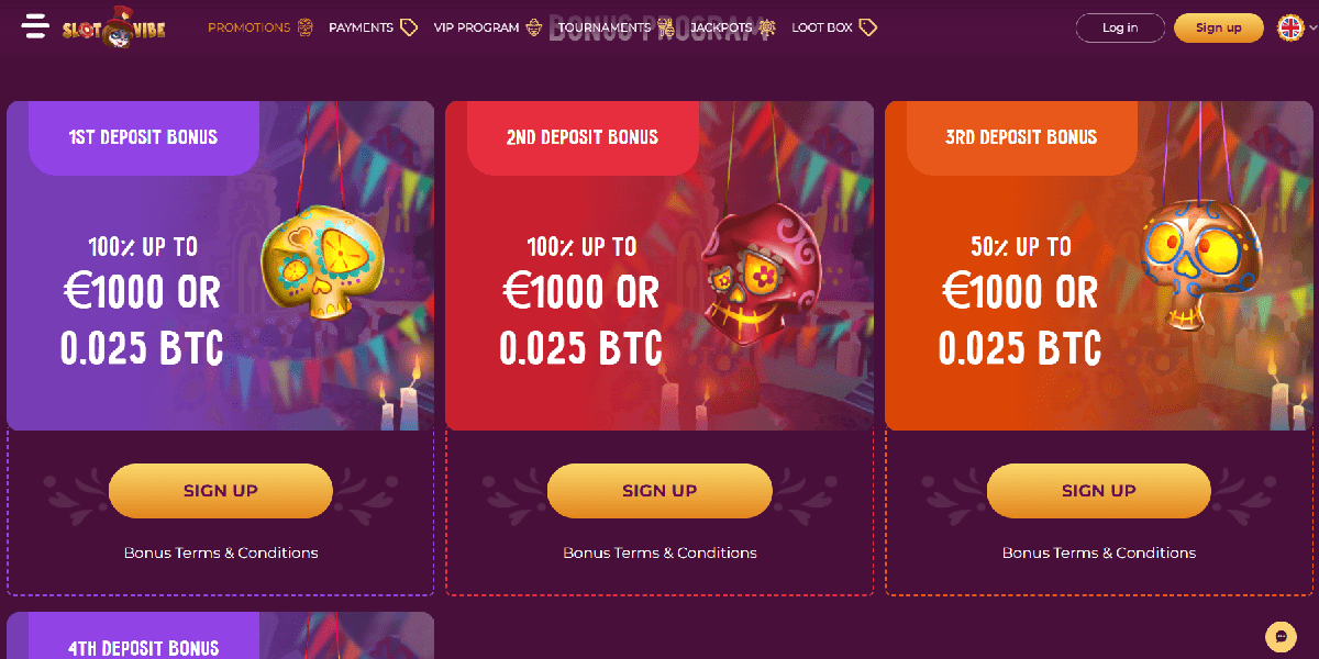 Dama N.V. war in letzter Zeit ziemlich produktiv; eine ihrer Spieleplattformen ist SlotVibe. Wie alle ihre anderen Casinos sticht SlotVibe dank seiner umfangreichen Spielebibliothek, seiner großzügigen Auswahl an Werbeaktionen und seines zweisprachigen Kundendienstes hervor. Darüber hinaus präsentiert es eine attraktive Website im Cartoon-Stil und mit lebendigen Grafiken, die wahrscheinlich vom mexikanischen Día de Los Muertos beeinflusst sind, da sie humorvolle Charaktere enthält, die so gekleidet sind.