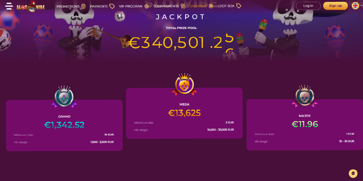 Dama N.V. war in letzter Zeit ziemlich produktiv; eine ihrer Spieleplattformen ist SlotVibe. Wie alle ihre anderen Casinos sticht SlotVibe dank seiner umfangreichen Spielebibliothek, seiner großzügigen Auswahl an Werbeaktionen und seines zweisprachigen Kundendienstes hervor. Darüber hinaus präsentiert es eine attraktive Website im Cartoon-Stil und mit lebendigen Grafiken, die wahrscheinlich vom mexikanischen Día de Los Muertos beeinflusst sind, da sie humorvolle Charaktere enthält, die so gekleidet sind.