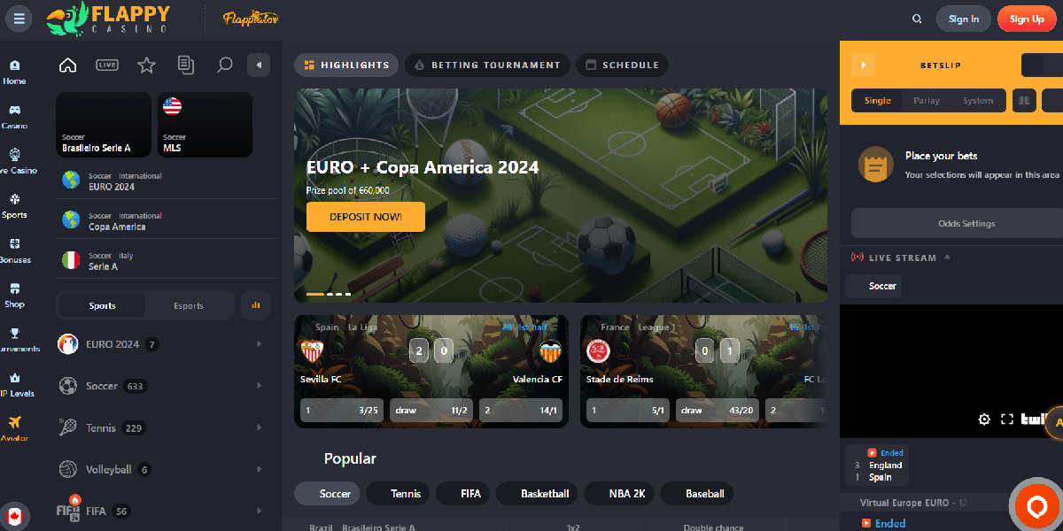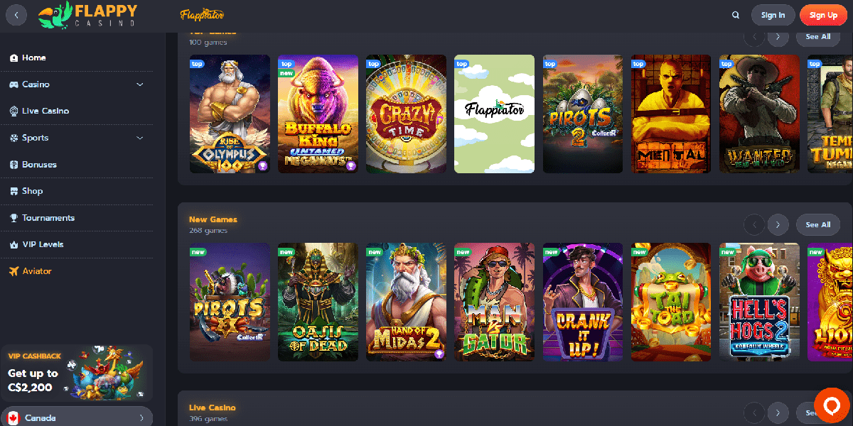 You will be overwhelmed with options when it comes to choosing which game to play first, thanks to the extensive library. Flappy Casino offers a wide variety of games for all types of players, including slots, table games, and crash games such as Spribe's Aviator.